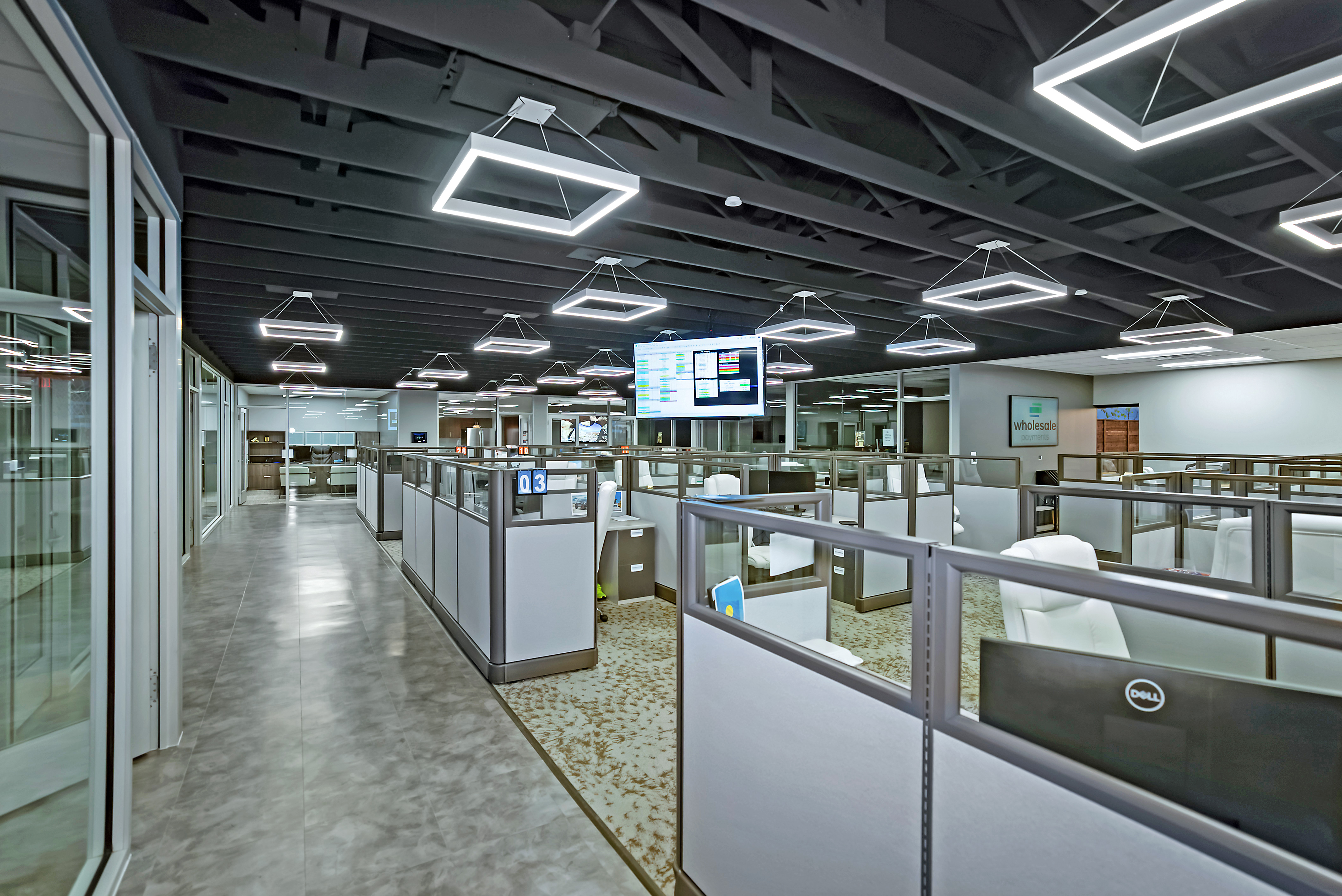 TCC completed a complete renovation of an existing building for Wholesale Payments's new Fort Worth office. The renovation included demolition of the existing interior and finish out of a new open concept office space with private offices with storefront glass entrances, a new electrical service, new rooftop HVAC units with exposed ductwork, new aluminum curtainwall at the building entrance and new flooring throughout.
